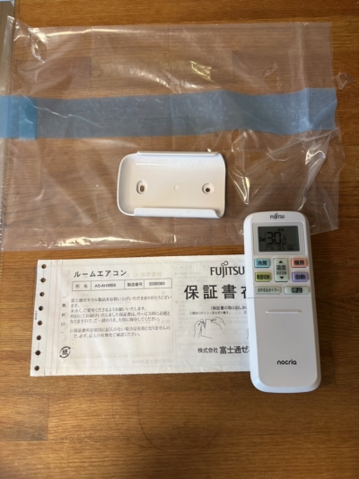 エアコンの保証書と、リモコンはこのような形でセットでお渡ししております。