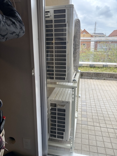 【家庭用エアコン】コンパクトタイプ7.1kw壁掛けエアコン入替え工事、こだわりの室外機二段置き金具再利用@八王子市南大沢2