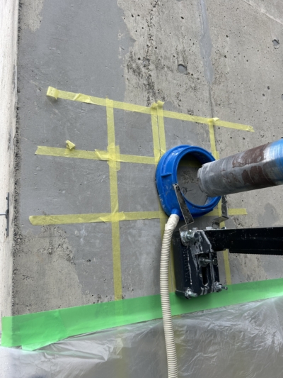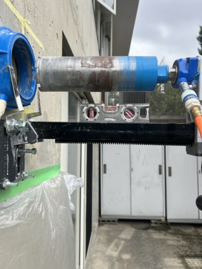 今回のコンクリート壁の穴あけ工事は、湿式工法にて穴あけをさせていただきました。
