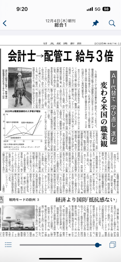 今朝の日経新聞に、アメリカで一流大学卒業後、会計士から配管工に転身し、年収が3倍に!